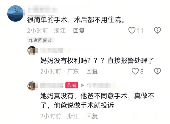 而且妈妈在家里没有话语权,老公不同意手术,孩子就做不了手术。孩子爸爸甚至放话,如果医生敢给做手术,他就投诉。
