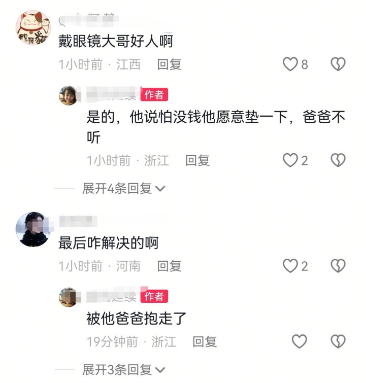 根据拍摄者称,最后确实就像视频里的那样,孩子被爸爸抱走了。