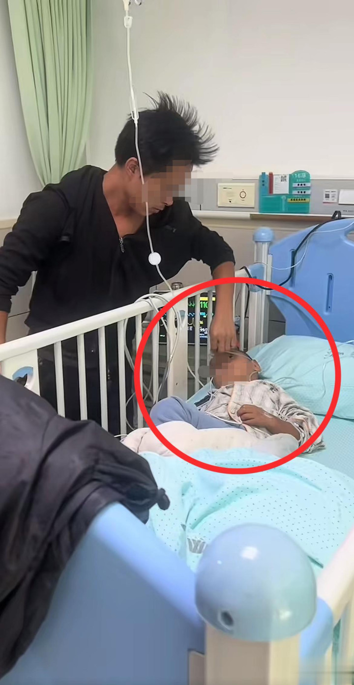最后大家放开了阻拦的手,让爸爸到病床前亲眼看看儿子的样子,眼神都已经不聚焦了,情况非常危急。
