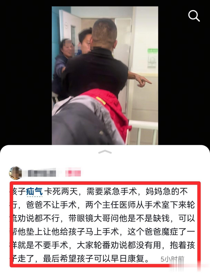 根据发布者透露,视频中的孩子疝气卡死两天,需要紧急手术。医院里的两个主任医师轮番劝孩子的父母,告知情况的紧急和危险,需要马上手术。妈妈听着急的不行,可是爸爸却始终不同意手术。