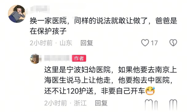 但是根据拍摄者解释,他们所在的医院已经是宁波最好的妇幼医院了,如果爸爸要带孩子往上一级医院,那大家都没有异议。不仅如此,爸爸还拒绝了120护送,非要自己开车前往。